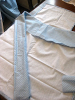 For the main part of my Dorothy costume (see here) I needed a blue pinafore. In the depths of my mind (and my wife reminded me) I remembered some blue and white dotty fabric that I had lurking from back when I made my coat a couple of years ago. I fished it out of its storage place and began thinking about how to make it into a Dorothy-worthy pinafore. I had already decided by this stage that I would wear a blue skirt of my wife's and that the pinafore was only an overgarment. I therefore decided to make it a little more like an apron, as I figured that would both be easier and use less fabric.